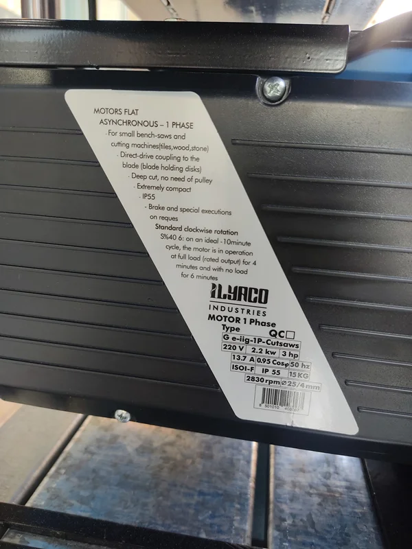 الکتروموتور این دستگاه دارای توان 3 اسب بخار و سرعت گردش 3000 دور در دقیقه بوده که به راحتی برش سنگ های ساختمانی را ممکن میسازد (تا ضخامت 8 سانتیمتر را به راحتی برش میدهد)